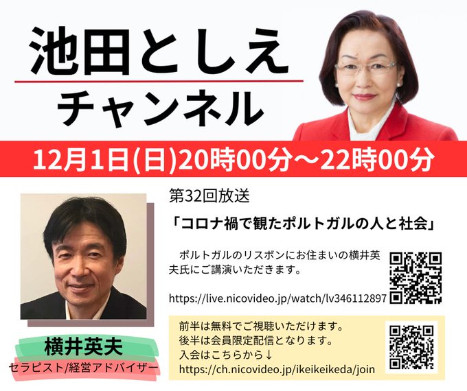 令和6年12月1日(日)20時~22時 第32回池田としえチャンネル ゲスト:横井英夫 「コロナ禍で観たポルトガルの人と社会」 https://live.nicovideo.jp/watch/lv346112897…