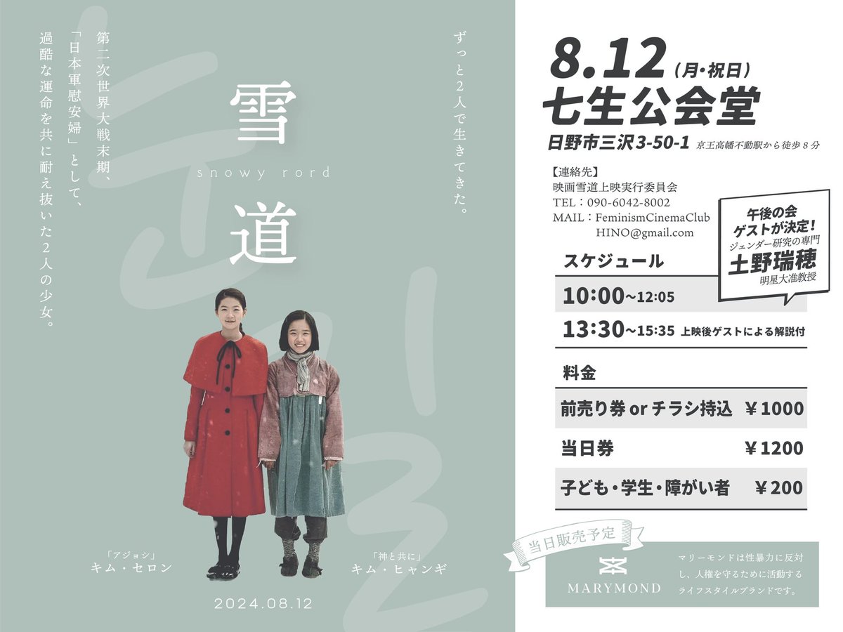 『雪道』上映会日時8月12日(祝日・月)①10:00〜12:05②13:30〜15:35*午後の上映後に明星大学・土野瑞穂准教授の解説トークあり場所七生公会堂料金前売りor当日チラシ持参1000円当日..