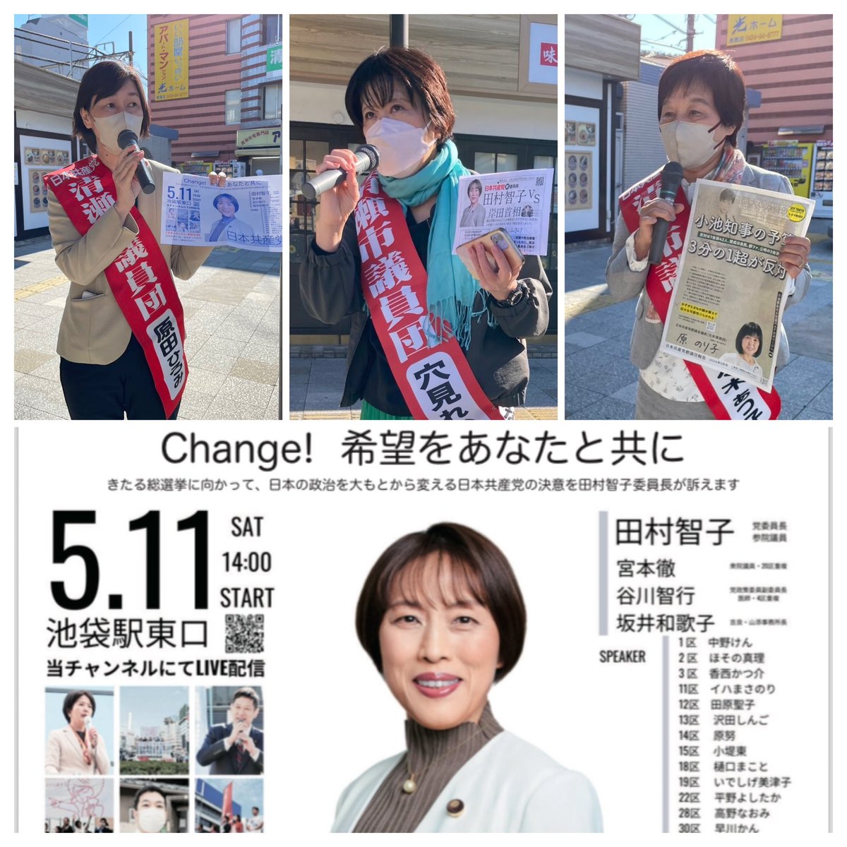 おはようございます!爽やかな朝の宣伝でした。でも終わる頃にはすでに暑く💦体調管理気をつけたいですね。5/11土曜の14時から、池袋駅東口で日本共産党の街頭演説です!けやきホールのセミナーハウスで視聴会..