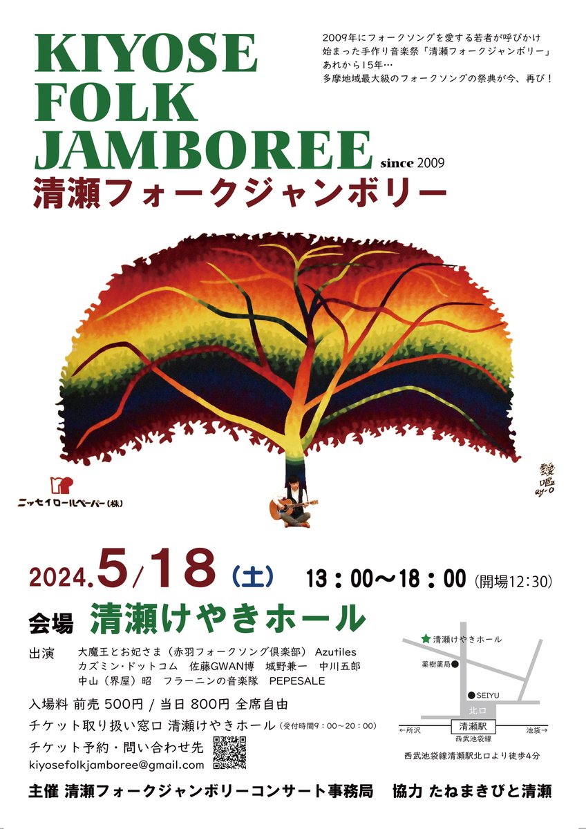 清瀬フォークジャンボリーまで残り3日です。前売チケットの予約および清瀬けやきホール窓口での販売は5月16日(木)20時までとなります。くれぐれもご注意ください。以降の取り扱いについては当日チケットにな..