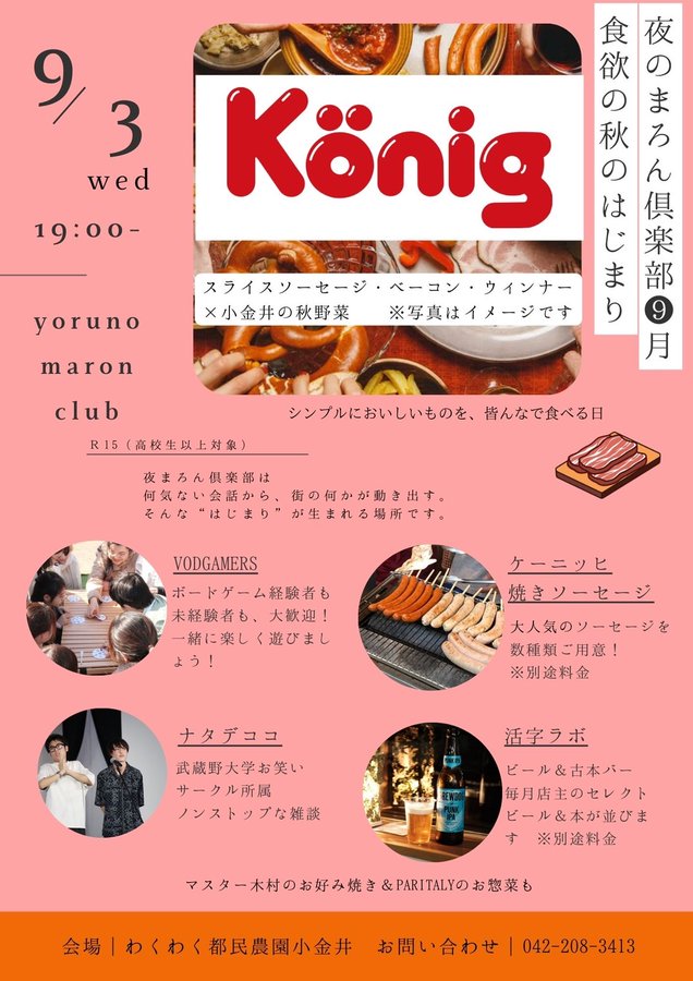 9月3日(水)は好評イベント「夜のまろん倶楽部」!わくわく都民農園小金井にて19時スタート。学生の方はまろんチケットが使えるので無料です。今回のゲスト出店はケーニッヒさん。また、高齢のお惣菜、お好み焼..