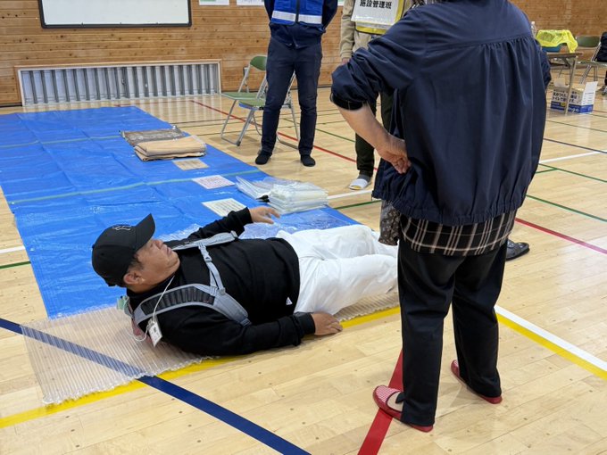 狛江市総合防災訓練狛江第一中学校避難所にてビニールマットを膨らませてベット代わりに起き上がるに大変でした!痩せます