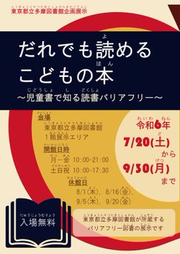 ◆企画展示「だれでも読めるこどもの本~児童書で知る読書バリアフリー~」@都立多摩図書館1階展示エリア#都立多摩図書館が所蔵するバリアフリー図書の展示です。詳細https://library.metro..
