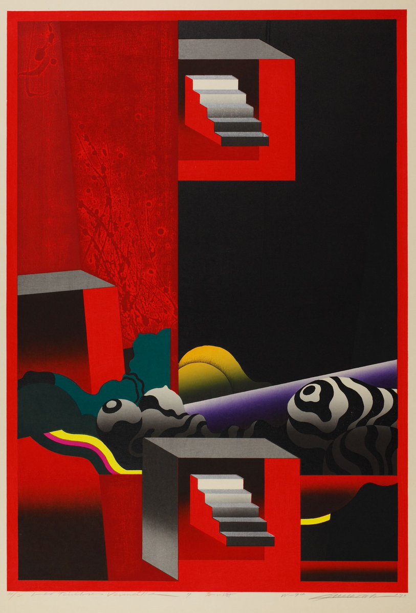 黒と赤の鮮烈な対比で衝撃を与えた〈赤い闇〉は、黒崎を代表するシリーズ。京都の顔料店で紹介された西ドイツ製の顔料を用い、同じ色を何度も摺り重ねて「芳年の血のような赤」を手に入れました。摺り回数は70~80回にも及ぶといいます。