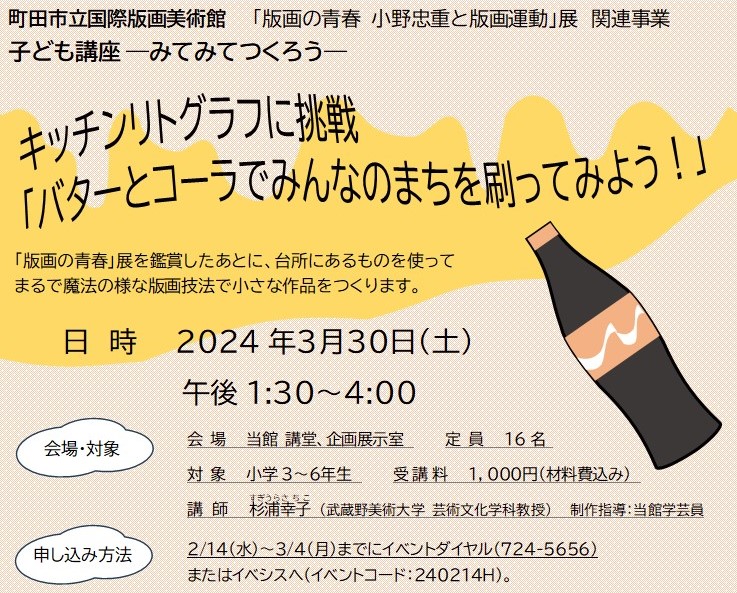子ども講座 -みてみてつくろう-キッチンリトグラフに挑戦「バターとコーラでみんなのまちを刷ってみよう」参加者募集中!!