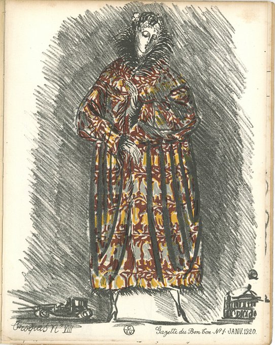 こちらのコート、柄をよく見ると、古代ギリシャ風の人物モティーフをあしらった布地が使用されています。 フォーヴィズムの画家ラウル・デュフィは、服飾デザイナーであるポール・ポワレに才能を見いだされ、テキスタイルのデザインも手がけました。