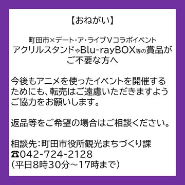 【町田市×デート・ア・ライブⅤコラボイベント】 町田市にお越しいただきありがとうございました。 アクスタ等の抽選賞品が当たった方は是非飾ってお楽しみください♪ なお、今後もイベントを開催するためにも賞品の転売はご遠慮ください。 ご不要な方は町田市へご相談ください。 #町田市デアラコラボ