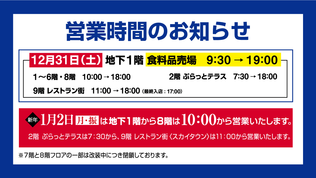 【営業時間のお知らせ】本日12月31日(土)は地下1階食料品売場は19:00まで、その他のフロアは18:00までの営業とさせていただきます。なお、明日2023年1月1日(日・祝)は全館休業日。新年は1..
