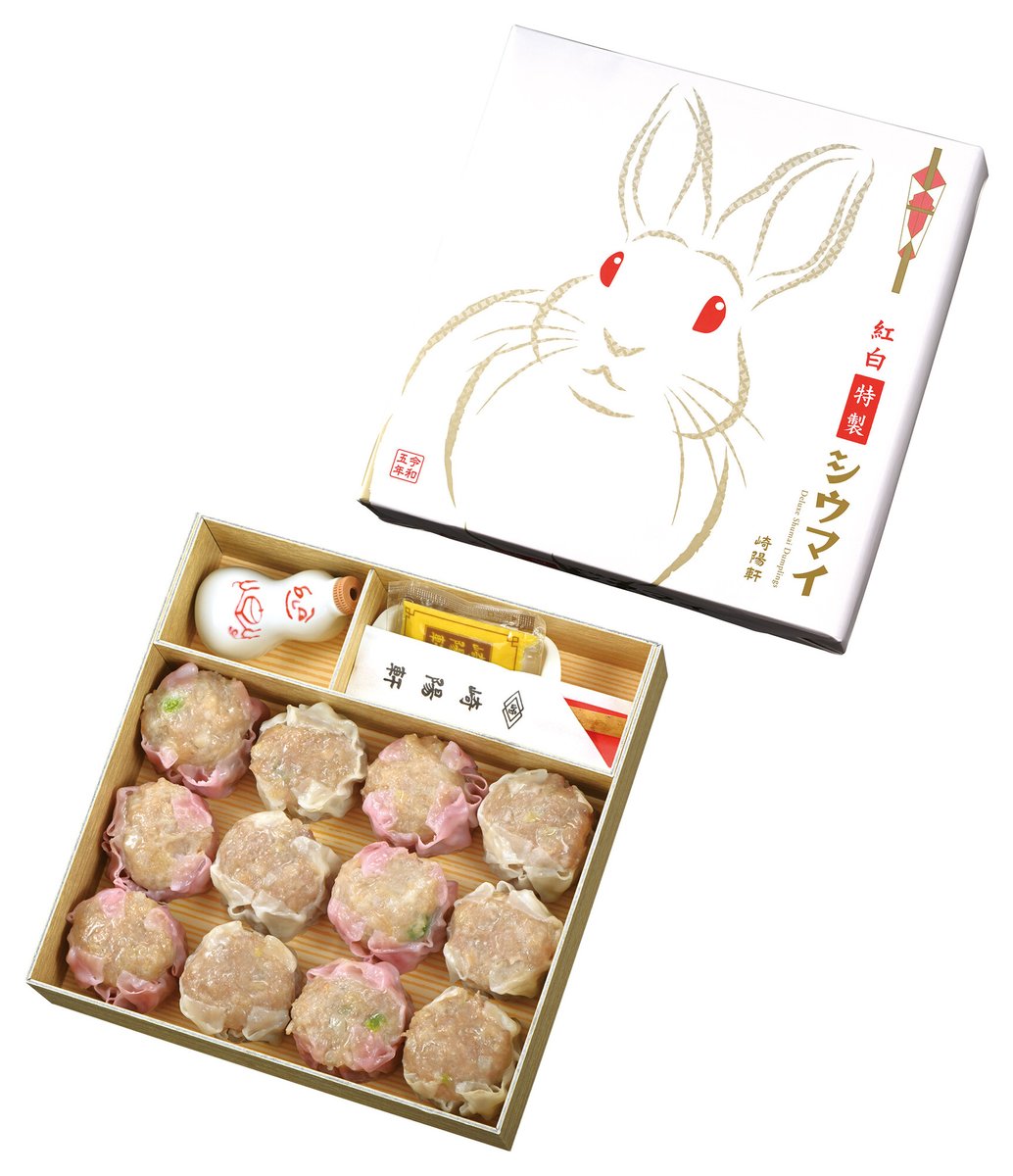 干支うさぎの特別パッケージ✨地下1階<崎陽軒>にお目見えした「紅白特製シウマイ12個入」1,460円。お馴染みの特製シウマイと淡い紅色の皮で包んだ特製シウマイを6個ずつ詰め合わせました。醤油入れ「ひょ..