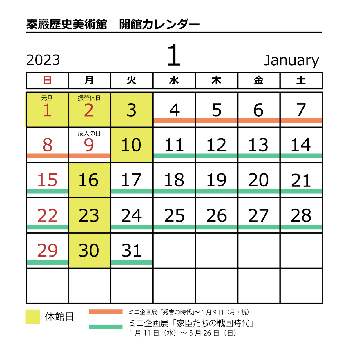 #泰巖歴史美術館は、事前予約なしでご来館いただけます。2023年1月の休館日:1月1日(日・祝)~3日(火)、10日(火)、16日(月)、23日(月)、30日(月)ミニ企画展「秀吉の時代」も開催中!ホ..
