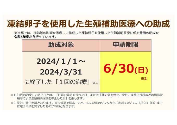 東京都では、加齢等の影響を考慮して作成した#凍結卵子を使用した生殖補助医療に係る費用の助成を令和5年度から行っています。令和6年1月1日から令和6年3月31日に終了した医療行為分については令和6年6月..