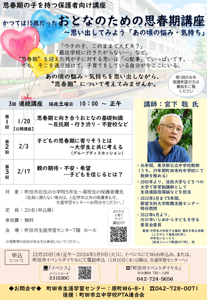 【連続講座】かつては15歳だったおとなのための思春期講座~思い出してみよう「あの頃の悩み・気持ち」を,2024年1月20日,2月3日,17日の土曜10時~正午に開催!申込みはイベントダイヤルまたはイベ..