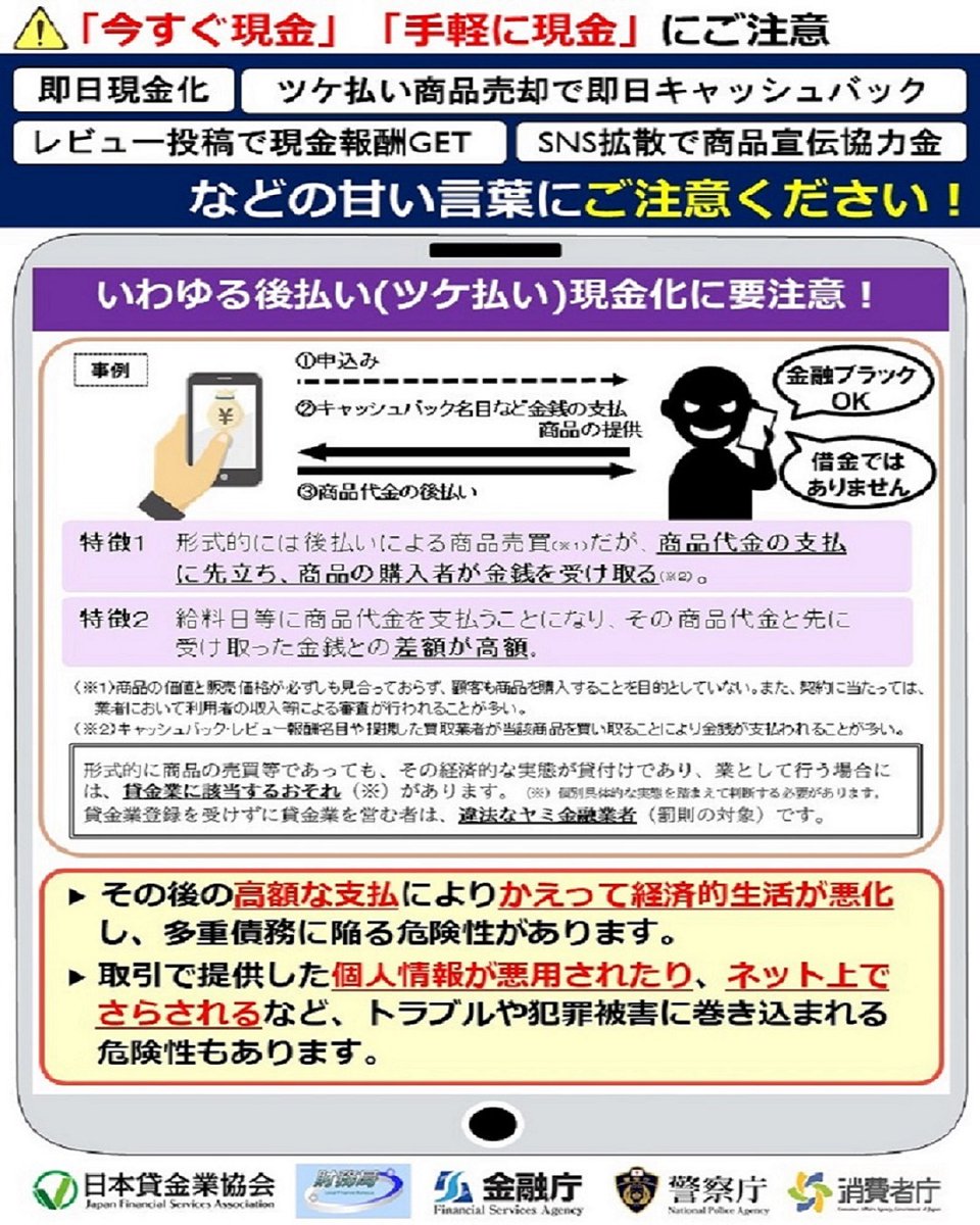 商品代金の支払いに先立ち、「レビュー投稿報酬」や「キャッシュバック」名目で金銭を交付し、その後高額な商品代金を払わせる「後払い現金化」という闇金手口があります!「即日現金化」「レビュー報酬で現金報酬G..