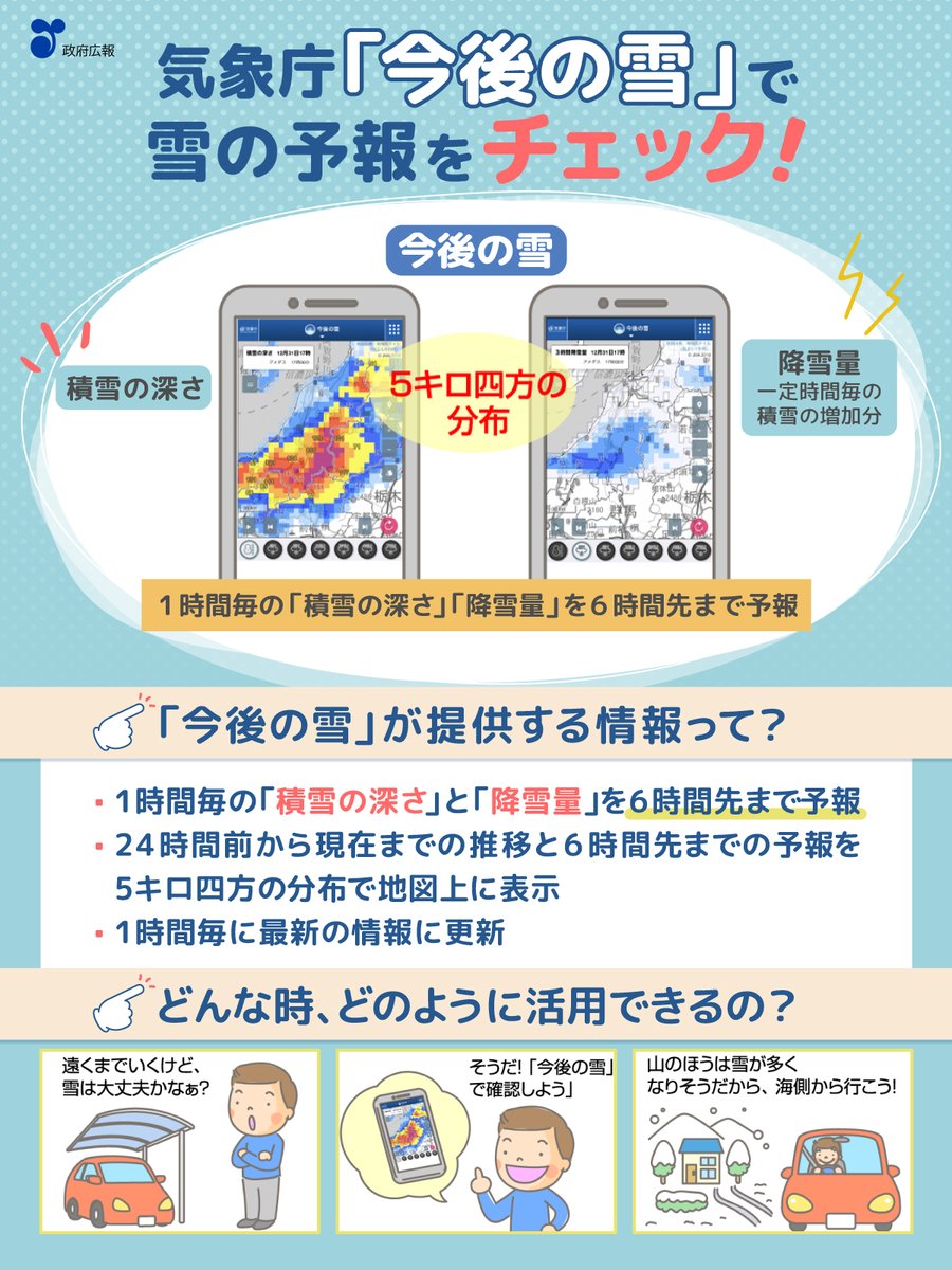 ❄️外出前に#今後の雪の確認を!💡気象庁のホームページでは、現在の雪の状況と6時間先までの予報を地図上で確認できるコンテンツ「今後の雪」を提供しています📱お出かけ前にチェックし、ルートや活動予定の変更..