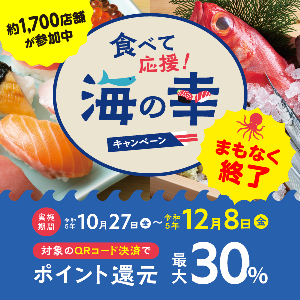 【まもなく終了!】「食べて応援!海の幸キャンペーン」都内のすし店や鮮魚小売店において対象のQRコード決済で支払うと決済額の最大30%のポイントが還元されるキャンペーンは残り1週間。12月8日(金)まで..