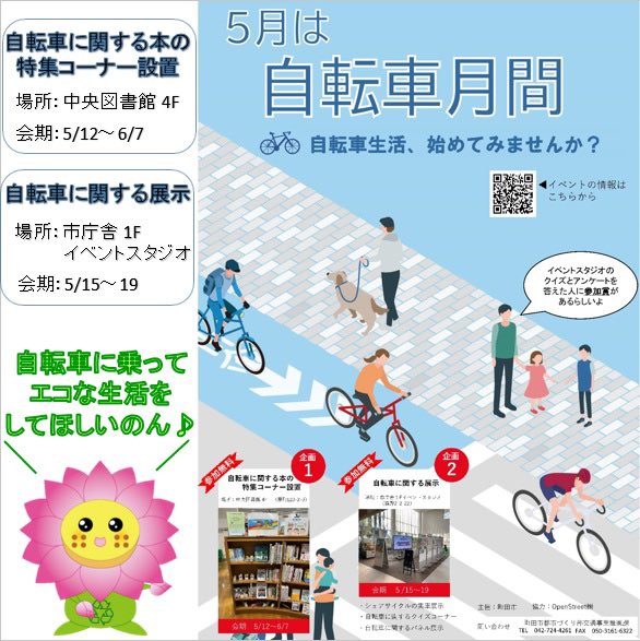 自転車に乗るとエコだのん♪ 自転車活用推進法で毎年5月を「自転車月間」と定めています。 市では「自転車月間」にあわせて、「自転車」に関する様々なイベントを実施します。 是非、お越しください!