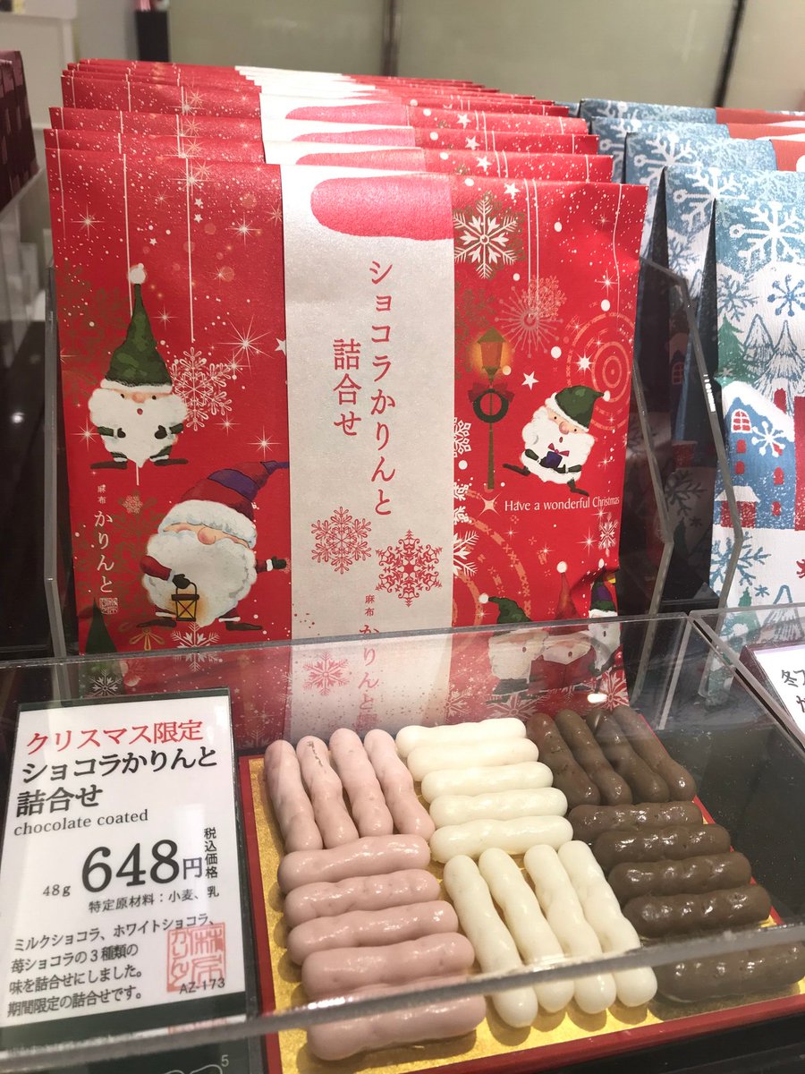 サンタさんの愛らしい表情に注目🎅 今の時季だけ味わえる「ショコラかりんと」をセットにした「クリスマス限定ショコラかりんと詰合せ」。ミルク、ホワイト、いちごの3フレーバーを楽しめます!プチギフトにもぴったり🎶 地下1階<麻布かりんと>