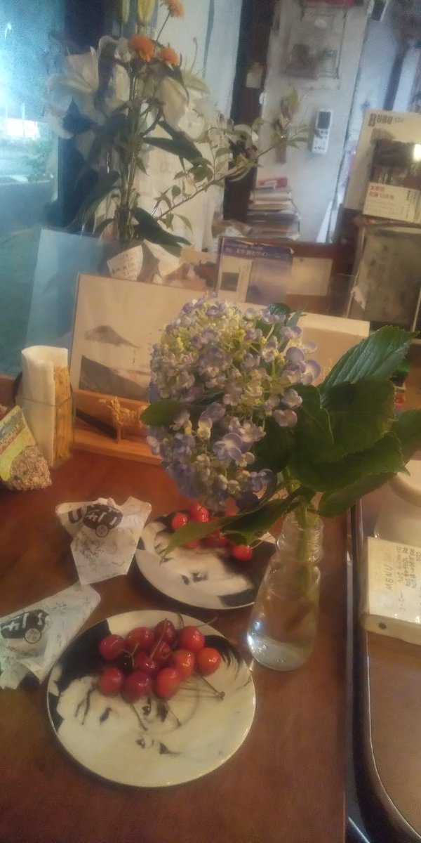 参加なくても「だるま紫陽花と資料だけでも」と土産下さった方も。じっくり読ませて頂きますね。資料を読み返したり今日は会えなかった方の投稿眺めたり、お客様から頂いた山形の追い桜桃摘みながら余韻に浸るのも良..