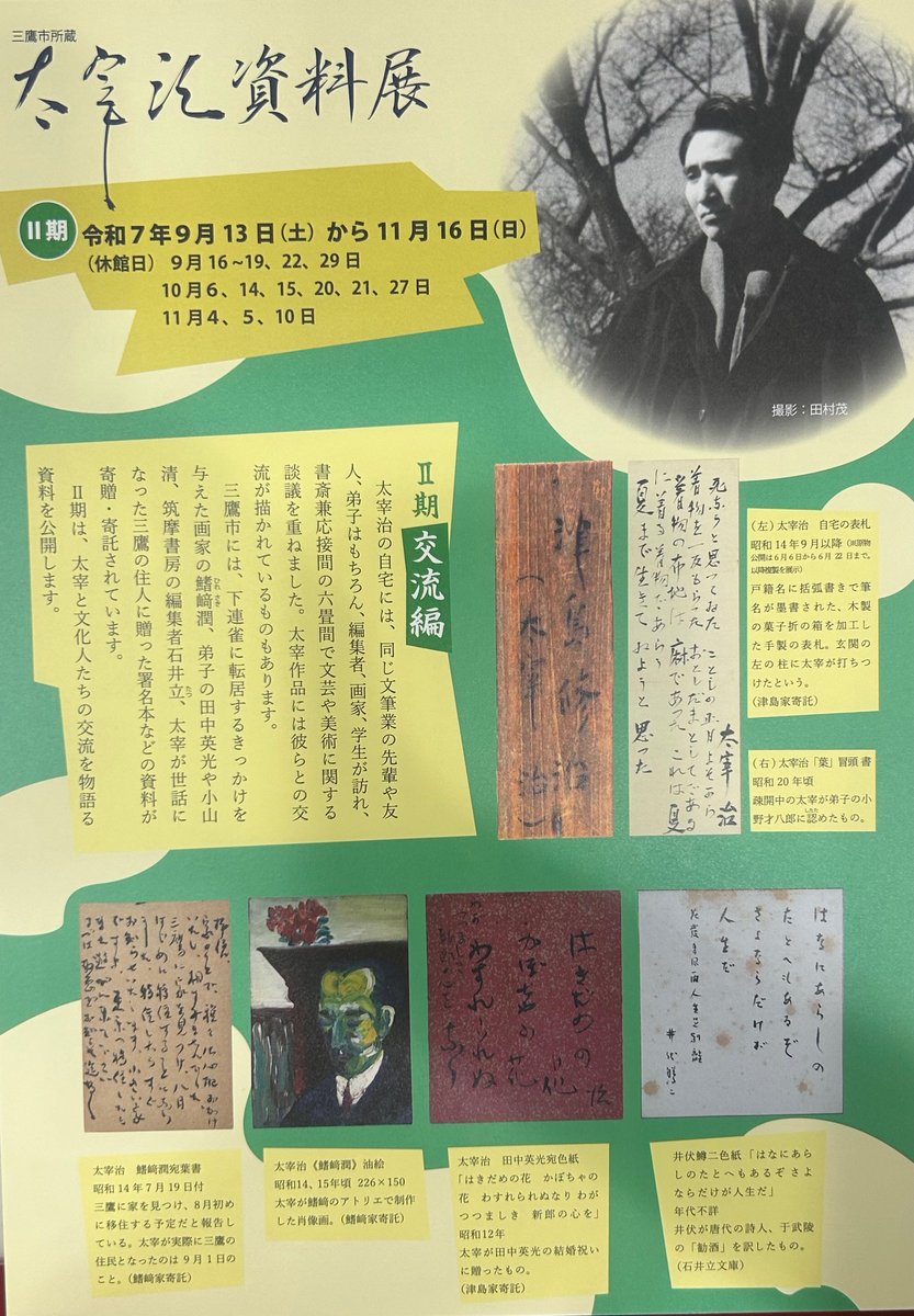 【太宰治展示室お知らせ】太宰治資料展~Ⅰ期桜桃忌編は今週末日曜(9/7)までです。9/9~9/12は展示替えのため休室します。Ⅱ期交流編は9/13から始まります。#太宰治#三鷹#文学