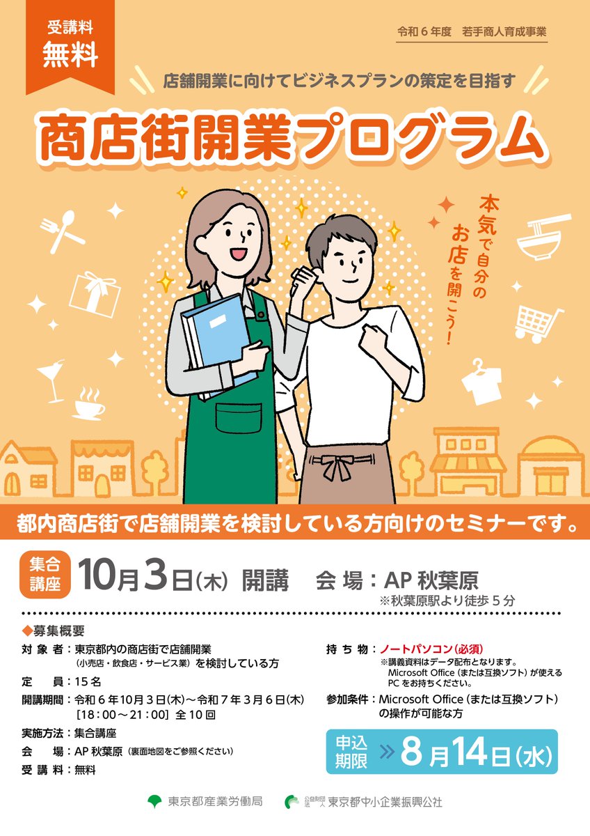 /【参加無料】商店街開業プログラム受講生募集中!\2024年10月3日~2025年3月6日/無料(申込締切:8月14日)都内商店街で小売店、飲食店、サービス業の店舗開業を検討している方を対象に、ビジネ..