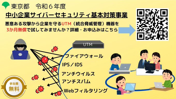 【東京都中小企業サイバーセキュリティ基本対策事業】サイバーセキュリティ対策の第一歩!UTMを貴社に3か月間設置し、その効果を確認してください。参加費無料!https://kihontaisaku.me..
