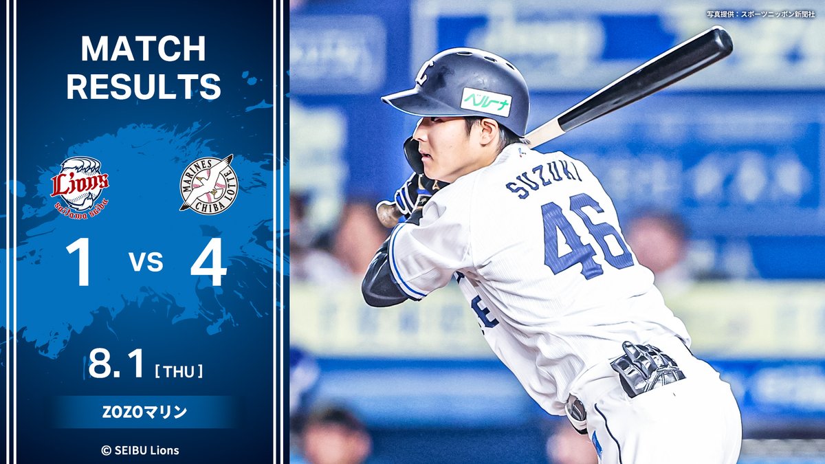 [8/1結果]L1-4M2点を先制されますが、5回に#鈴木将平選手の適時打で1点を返します。その後#柘植世那選手が好守備を見せますが、追加点を許す展開に。8回に得点圏に走者を進めるも、得点に結びつける..