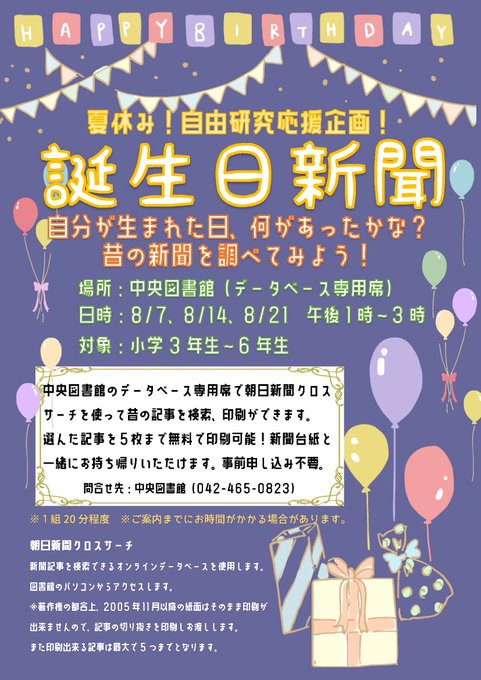 \#自由研究おうえん企画!/『誕生日新聞』をつくろう#新聞データベースをつかって、自分が生まれた日のことを調べてみよう!気に入った新聞記事は印刷してプレゼント!8月7日・14日・21日午後1~3時の間..