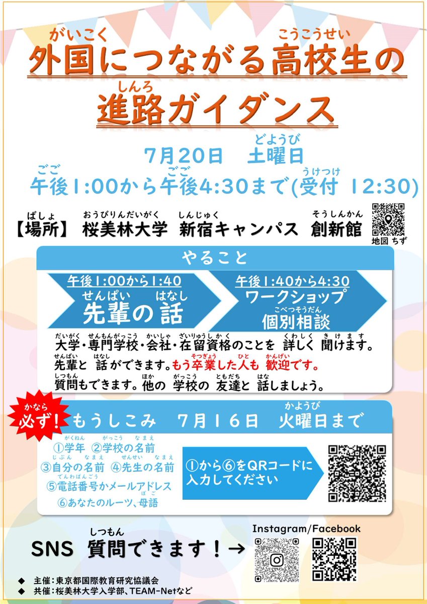 東京都国際教育研究協議会より【外国につながる高校生の進路ガイダンス】7/20(土)13:00~16:30無料桜美林大学新宿キャンパス創新館申込み:7/16(火)まで大学や専門学校、会社など進路について..