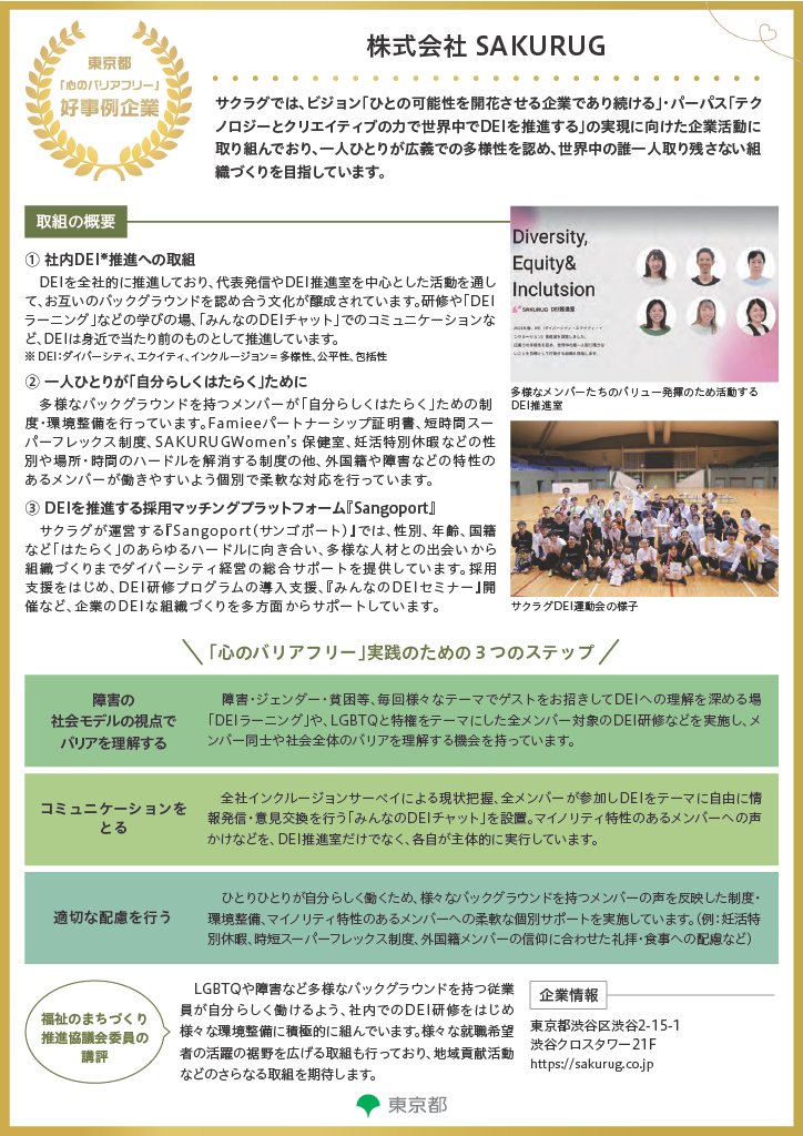 令和5年度東京都#心のバリアフリー好事例企業#株式会社SAKURUG一人ひとりが広義での多様性を認め、世界中の誰一人取り残さない組織づくりを目指しています。https://kokorobf-suppo..