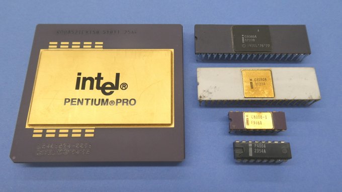 #マイコン博物館所蔵品紹介IntelCPU最初のCPUと金塊のような巨大CPU発表年、名称、bit数、トランジスタ数1971年i40044bit2300個1972年i80088bit3500個1974..