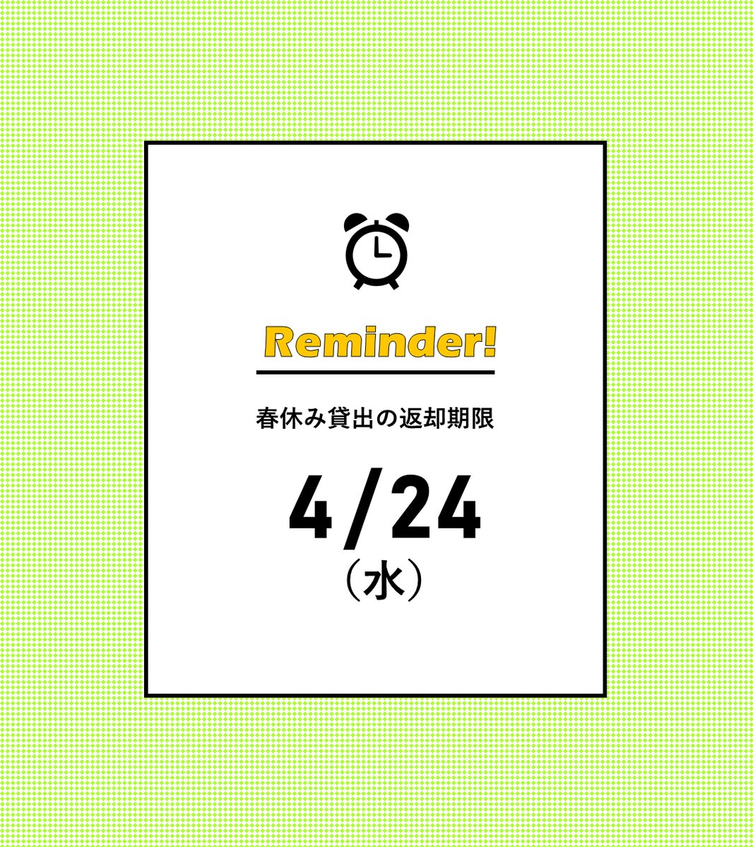 春休み貸出資料の返却期限は、本日4/24(水)です。19時まで開館しています。お忘れなく!000