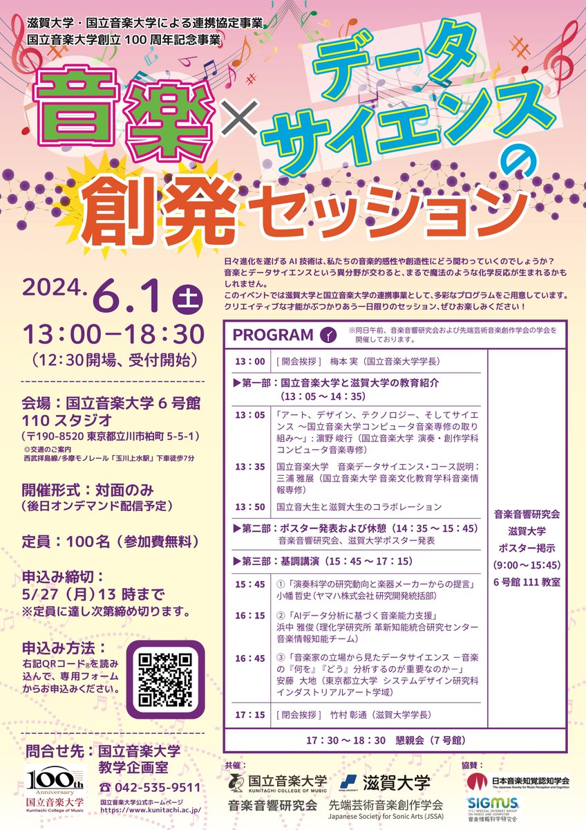 本学創立100周年記念事業「音楽×データサイエンスの創発セッション」を、6/1(土)に開催します!滋賀大学との共催で行う、音楽とAI・データサイエンスの異分野が交じり合う1日限定のイベントです♪申込締..
