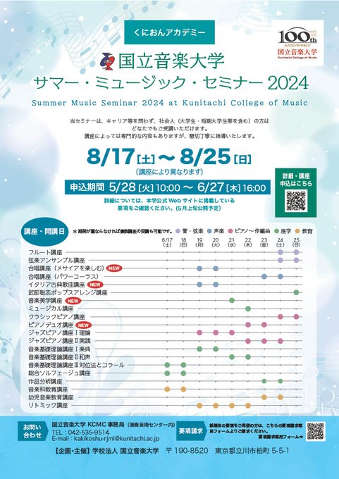 毎年ご好評いただいている「夏期音楽講習会」を、今年度からは「サマー・ミュージック・セミナー」に名称変更し開催いたします。詳細はこちらhttps://x.gd/mEqx9