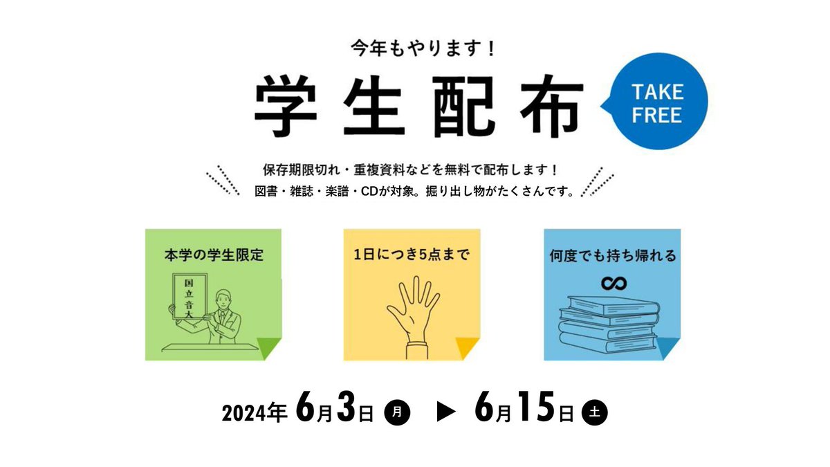 【学生の皆さまへ】\来週/学生配布を行います!保存期限切れ・重複などの資料を無料で配布します。一回につき5点まで、何度でも持ち帰れます!■対象資料:図書・雑誌・楽譜・CD■期間:6月3日(月)~6月1..