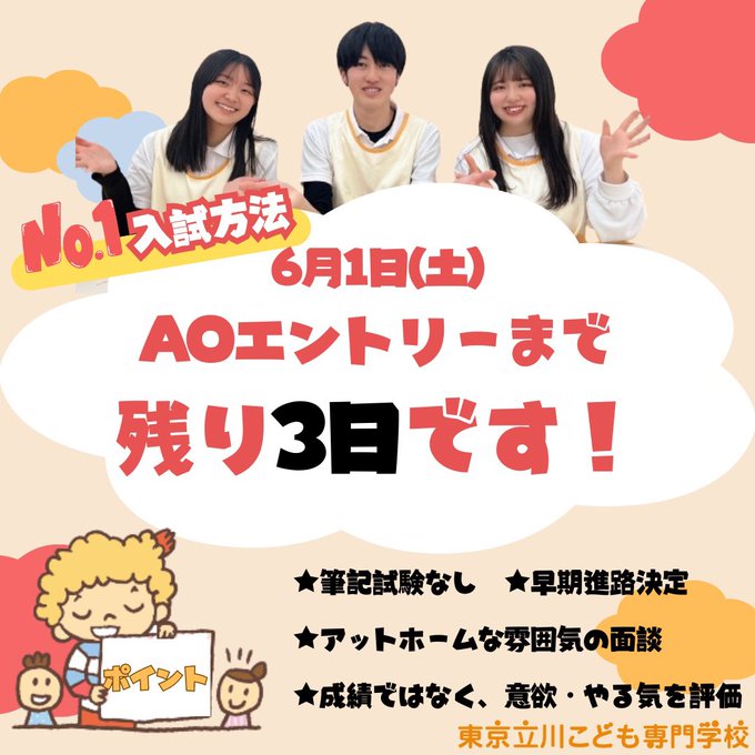 【AOエントリー開始まで残り3日!】本校1番人気の入試方法であるAO入試のエントリー開始が6/1に迫っています!スピーディーに進路活動をしたい方にとってもおすすめオープンキャンパス▽▼ご予約はこちら▼..