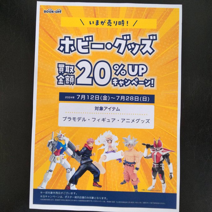 おはようございます 本日も10:00~21:00まで営業中です プラモデル・フィギュア・グッズの買取金額20%アップキャンペーン開催中 是非当店までお越しくださいませ #ブックオフ #買取 #キャンペーン