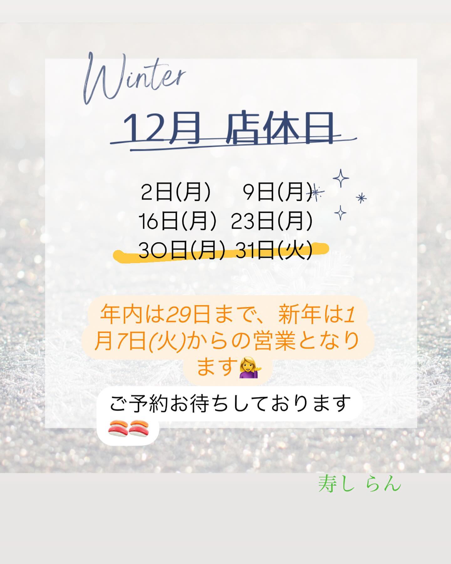 ’こんにちは☀️あっという間に今年もあと1ヶ月ですね💦寒くなってきたので風邪にはお気をつけください!年末年始のお知らせです!年末年始は休まず営業いたします!オープンは10時30~閉店時間が日によって異..
