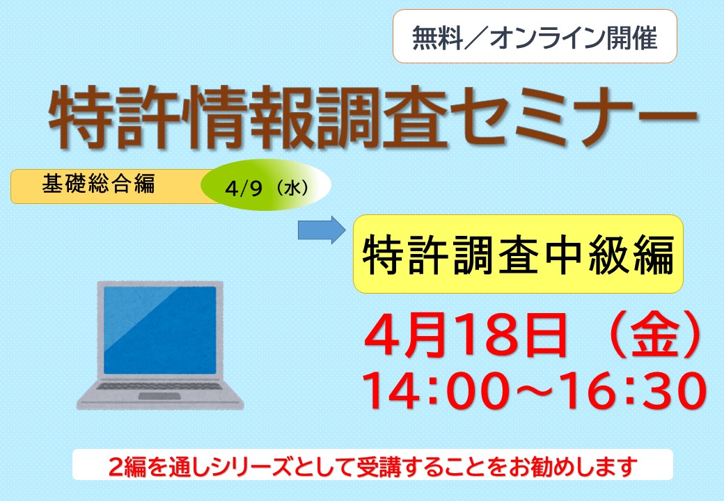 /#特許調査セミナー中級編、開催迫る\申込期限は4/17(木)正午まで中級編では特許分類や検索式作成など一歩進んだ特許調査の実務を解説一緒に実習しながら#スキルアップ#無料#オンラインセミナー詳細はこ..