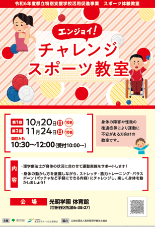 【エンジョイ!チャレンジスポーツ教室参加者募集!】10月20日(日)10:30から#光明学園で行います。身体の障害や怪我の後遺症等、運動に不安がある方向けの教室。#理学療法士がサポート。身体の動かし方..