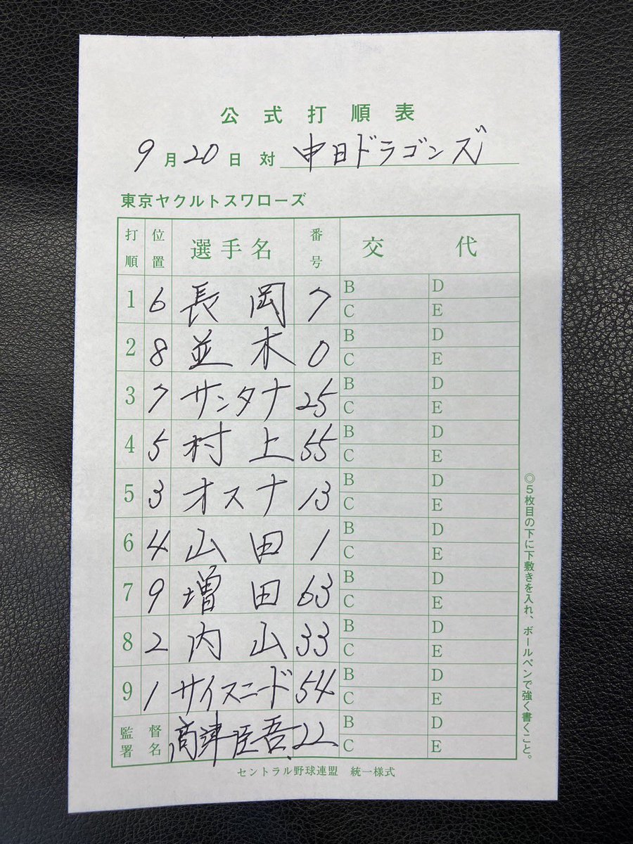 9月20日(金)vs.中日ドラゴンズ18:00試合開始スワローズ本日のスタメン#swallows#ヤり返せ