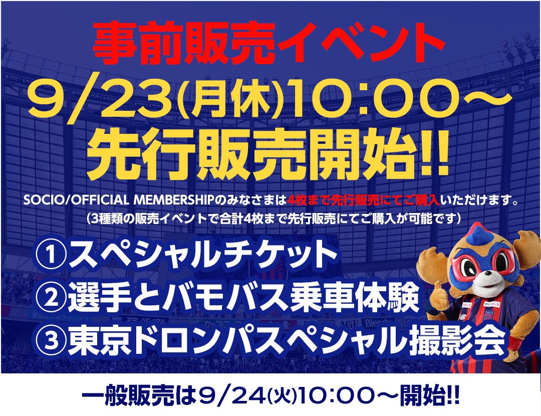 10/13(日)#味の素スタジアムにて開催されるFANCOMMUNICATIONDAYpresentedbyJOYSOUNDで実施する事前販売イベントの先行販売が明日9/23(月休)10:00~開始先..