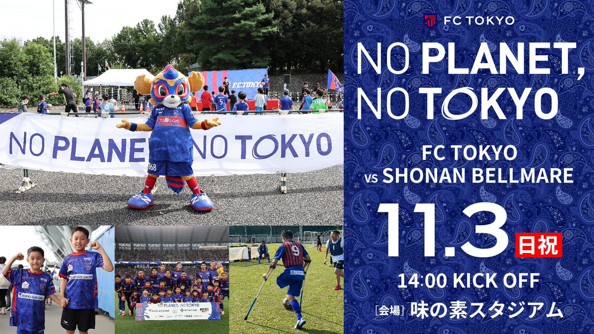 11月3日(日祝)に開催される#湘南ベルマーレ戦にて、『NOPLANET,NOTOKYO』を開催!!https://fctokyo.co.jp/news/16284これからの未来を担う子どもたちととも..