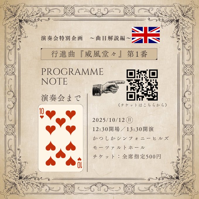 演奏会まで #あと10日! 本日はカウントダウンと共に、オールエルガープログラムの一曲、行進曲『#威風堂々』第1番の #曲目解説 をお届けします。 今やイギリス第二の国歌とも呼ばれる有名な旋律に対する、#エルガー の想いに心馳せてみてください http://teket.jp/10435/50313 #目白フィル