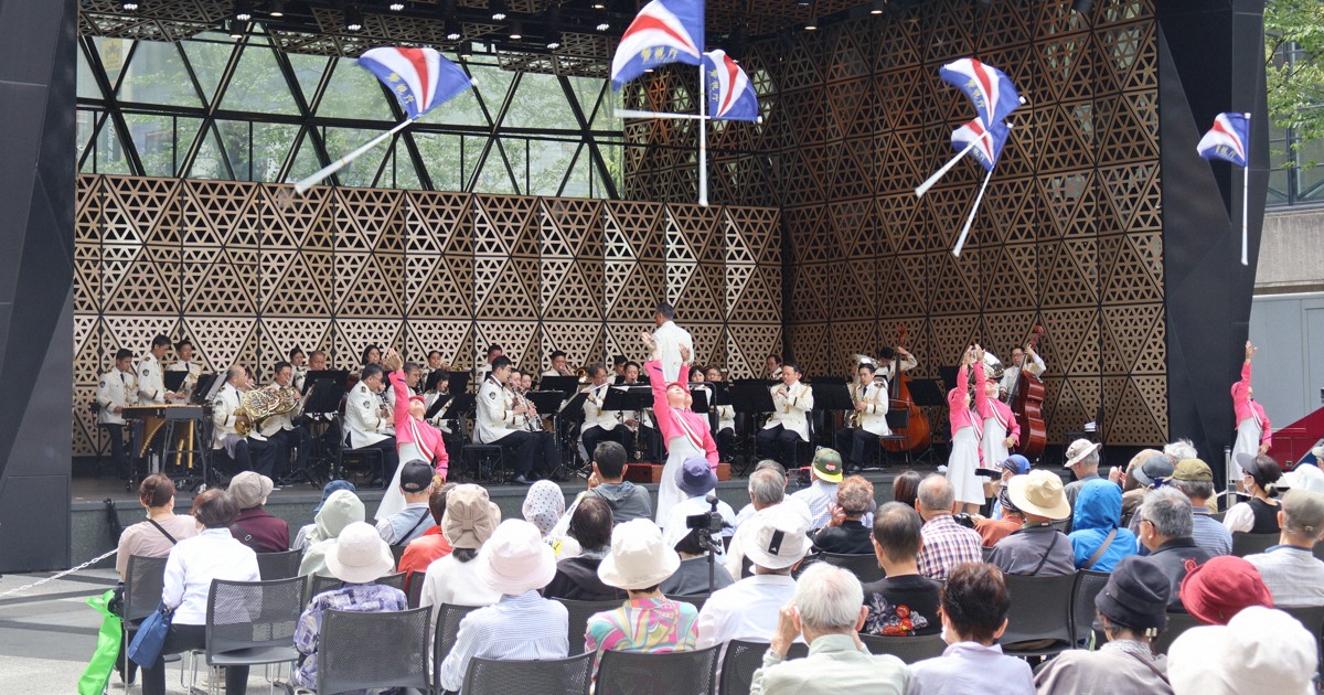 警視庁音楽隊の今年度初めての「水曜コンサート」(東京都、東京芸術劇場主催)が22日、豊島区の池袋西口公園野外劇場グローバルリングシアターで開かれ、約500人が演奏に聴き入った。