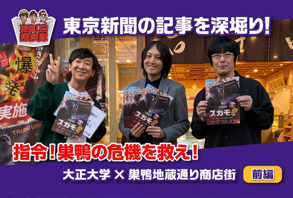 #東京03 の動画コンテンツ #ぐるり東京 探検隊を更新しました。 #大正大学 の学生達が行う、 #巣鴨 の商店街の謎解きイベントを訪ねて #巣鴨地蔵通り商店街 を訪れます。前編は、イベント主催に携わり大正大学で勤務している地域魅力推進部のお話をお伺いました。www.tokyo-np.co.jp/article/2..