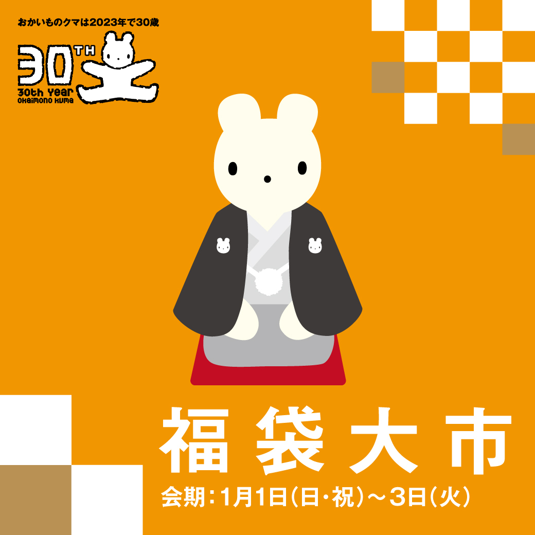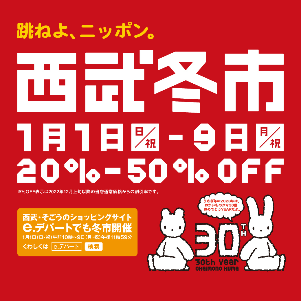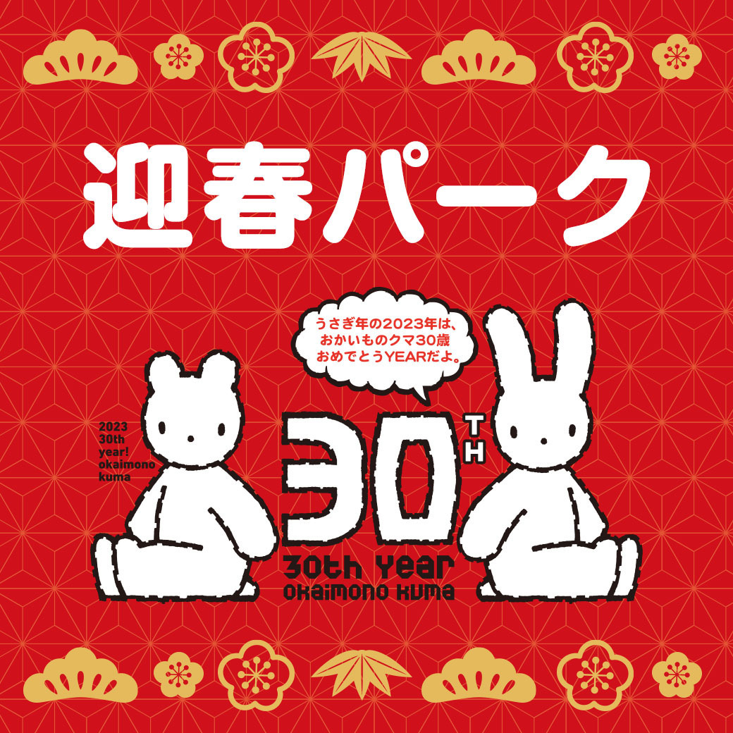 うさぎ年の2023年は、おかいものクマ30歳おめでとうYEARだよ。#西武冬市 でおトクなお買物をお楽しみください♪おかいものクマと遊べるアトラクションや芸人ライブ、新春の和楽器演奏など、お楽しみがいっぱいの迎春パークもチェック!