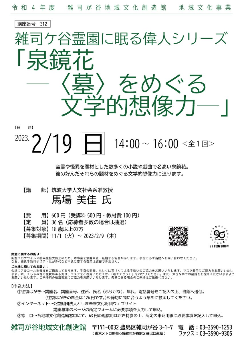 【講座情報】2/19(日)開催『雑司ケ谷霊園に眠る偉人シリーズ「泉鏡花―<墓>をめぐる文学的想像力―」』(全1回)ただ今受講生募集中!