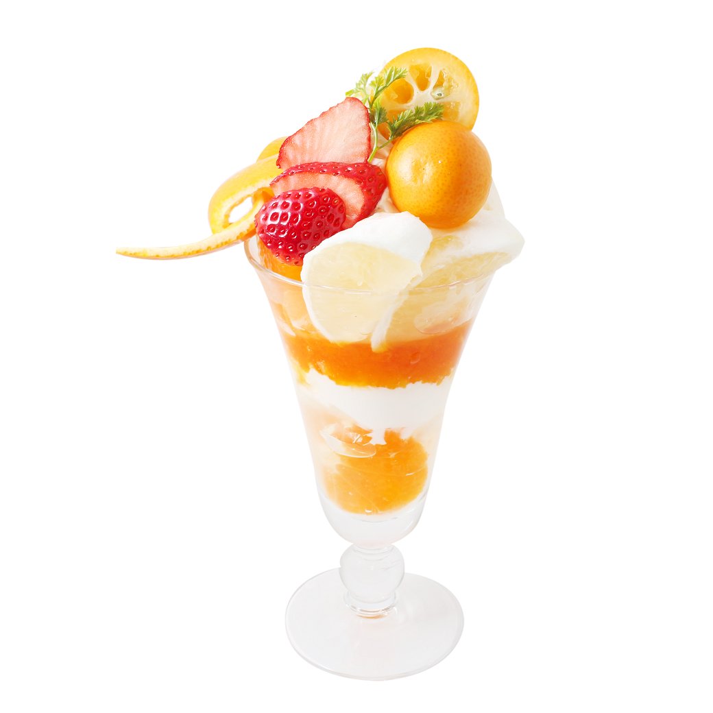 旬の柑橘をデコレーションからソースまで味わえるパフェが登場♪ヨーグルトアイス、クリームチーズアイス、オレンジシャーベットとの相性も抜群です。