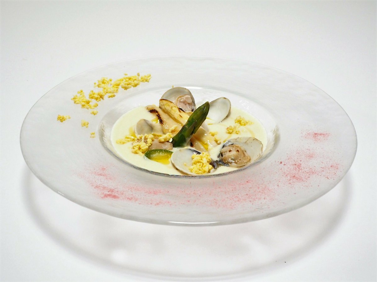 ラ・ベットラ・ダ・オチアイの2月のおすすめは「ホワイトアスパラと蛤の温かいポタージュ」。ディナーコース各日限定5食でご用意。ホワイトアスパラの甘味と蛤の旨味が合わさった一皿です。