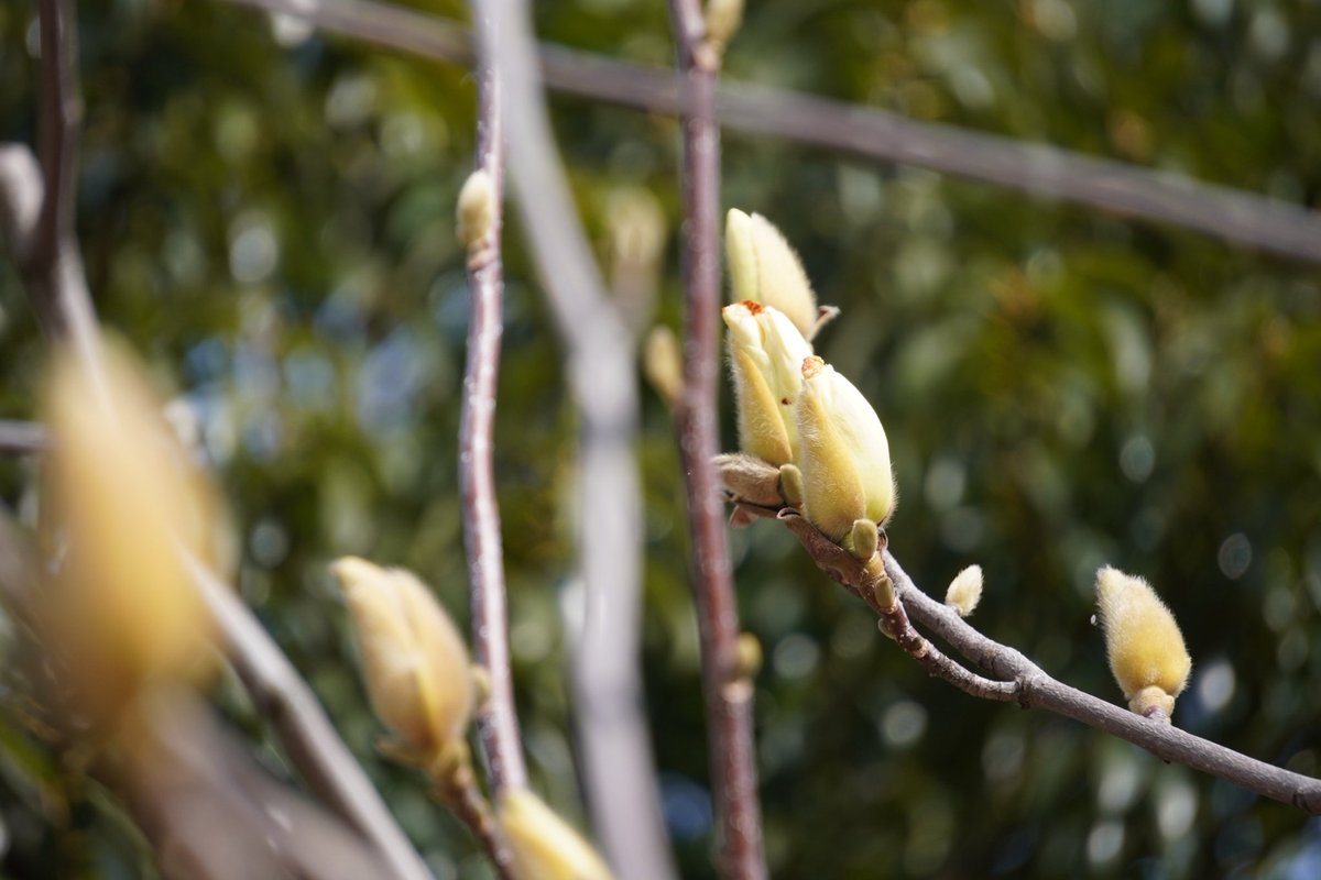 ハクモクレンが暖かな日差しの方を向いて、花芽を出しています。白っぽい軟毛に覆われた花芽と、横からは葉芽も見えてきました。お散歩時に、ぜひご覧下さい😊